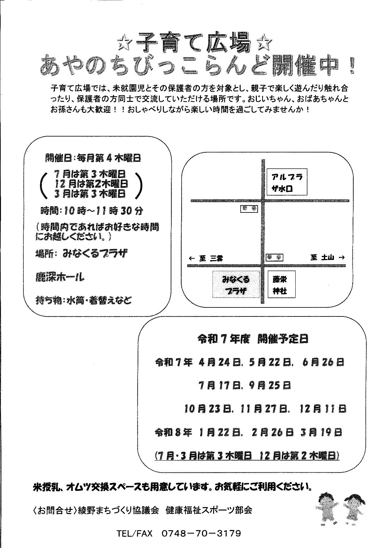 子育て広場 あやのちびっこらんど あそぶ 出産前 ママ・パパ 未就園児 開催日 2026.02.26(木) 開催時間 10:00~11:30 締切 開催場所 みなくるプラザ 鹿深ホール MAP 電話番号 0748-70-3179 保護者参加 要 きょうだい参加 可 参加費 無料 託児 無 詳細 未就園児とその保護者の方を対象とし、親子で楽しく遊んだり触れ合ったり、保護者同士で交流していただける場所です。 おじいちゃん、おばあちゃんとお孫さんも大歓迎! おしゃべりしながら楽しい時間を過ごしてみませんか! 問合せ:綾野まちづくり協議会 0748-70-3179 一覧に戻る 施設アイコンの説明 アイコンの説明。アイコンの説明。アイコンの説明。 アイコンの説明。アイコンの説明。アイコンの説明。 アイコンの説明。アイコンの説明。アイコンの説明。 アイコンの説明。アイコンの説明。アイコンの説明。 アイコンの説明。アイコンの説明。アイコンの説明。 アイコンの説明。アイコンの説明。アイコンの説明。 アイコンの説明。アイコンの説明。アイコンの説明。 アイコンの説明。アイコンの説明。アイコンの説明。 アイコンの説明。アイコンの説明。アイコンの説明。 アイコンの説明。アイコンの説明。アイコンの説明。 閉じる