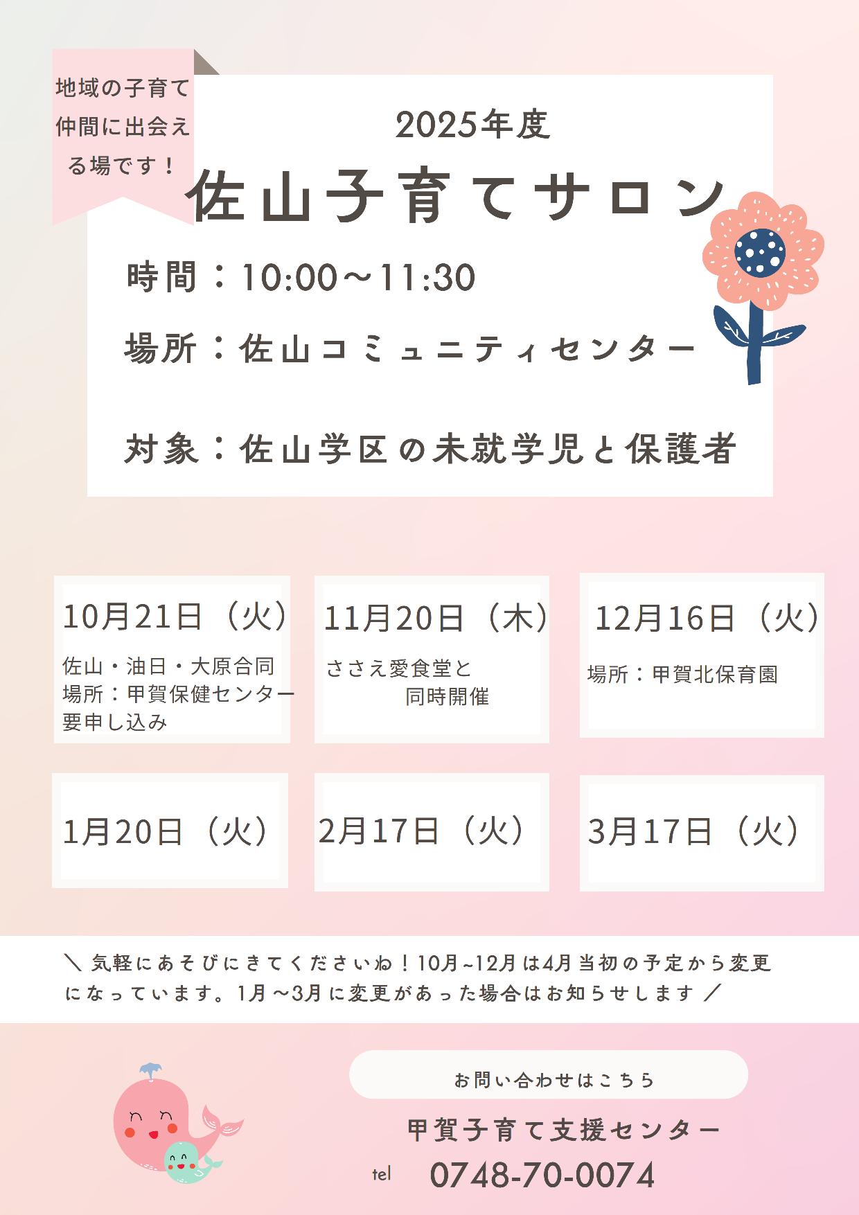 佐山学区 子育てサロン あそぶ 出産前 ママ・パパ 未就園児 開催日 2026.03.17(火) 開催時間 10:00~11:30 締切 開催場所 佐山コミュニティセンターまたは甲賀北保育園 MAP 電話番号 0748-70-0074 保護者参加 要 きょうだい参加 可 参加費 無料 託児 無 詳細 地域の子育て仲間に出会える場です! 気軽にあそびにきてくださいね! 対象:佐山学区の未就園児と保護者 一覧に戻る 施設アイコンの説明 アイコンの説明。アイコンの説明。アイコンの説明。 アイコンの説明。アイコンの説明。アイコンの説明。 アイコンの説明。アイコンの説明。アイコンの説明。 アイコンの説明。アイコンの説明。アイコンの説明。 アイコンの説明。アイコンの説明。アイコンの説明。 アイコンの説明。アイコンの説明。アイコンの説明。 アイコンの説明。アイコンの説明。アイコンの説明。 アイコンの説明。アイコンの説明。アイコンの説明。 アイコンの説明。アイコンの説明。アイコンの説明。 アイコンの説明。アイコンの説明。アイコンの説明。 閉じる