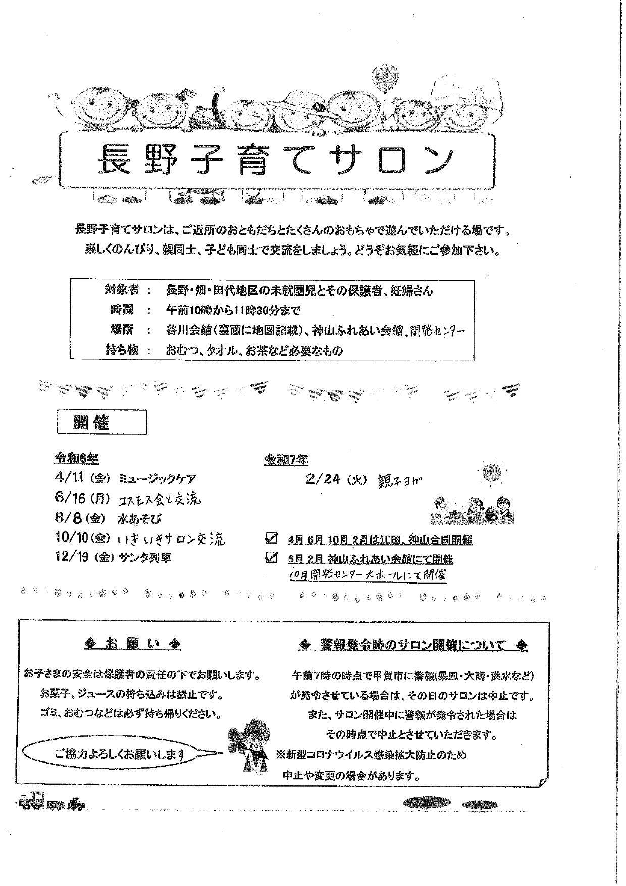 長野子育てサロン あそぶ 出産前 ママ・パパ 未就園児 開催日 2026.02.24(火) 開催時間 10:00~11:30 締切 開催場所 神山ふれあい会館 MAP 保護者参加 要 きょうだい参加 可 参加費 無料 託児 無 詳細 長野子育てサロンは、ご近所のおともだちとたくさんのおもちゃで遊んでいただける場です。 楽しくのんびり、親同士・子ども同士で交流しましょう。 どうぞお気楽にご参加下さい。 親子ヨガ 対象:長野・畑・田代地区の未就園児とその保護者、妊婦さん ※神山・江田子育てサロンと合同開催 一覧に戻る 施設アイコンの説明 アイコンの説明。アイコンの説明。アイコンの説明。 アイコンの説明。アイコンの説明。アイコンの説明。 アイコンの説明。アイコンの説明。アイコンの説明。 アイコンの説明。アイコンの説明。アイコンの説明。 アイコンの説明。アイコンの説明。アイコンの説明。 アイコンの説明。アイコンの説明。アイコンの説明。 アイコンの説明。アイコンの説明。アイコンの説明。 アイコンの説明。アイコンの説明。アイコンの説明。 アイコンの説明。アイコンの説明。アイコンの説明。 アイコンの説明。アイコンの説明。アイコンの説明。 閉じる