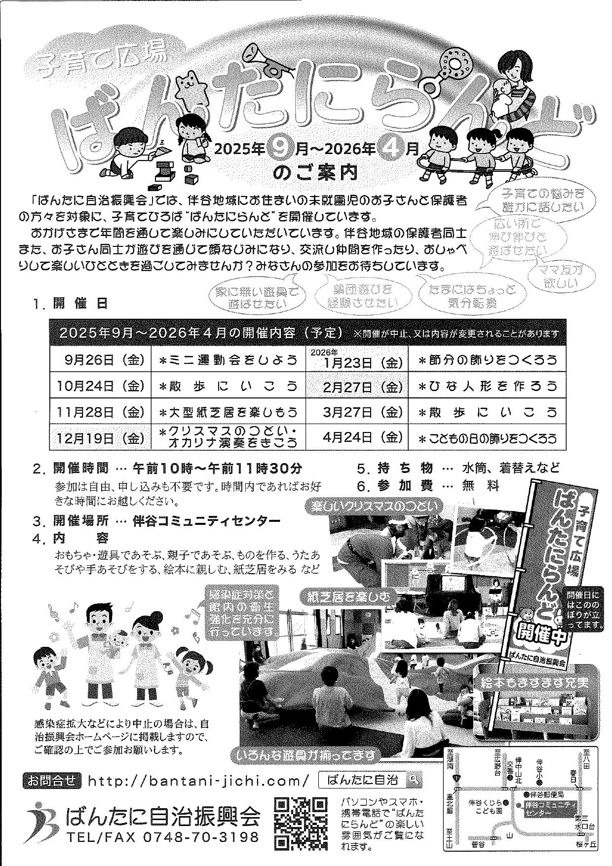 | 詳細 | 「伴谷自治振興会」では、伴谷地域にお住いの未就園児のお子さんと保護者の方対象に、子育てひろば”ばんたにらんど”を開催しています。 内容:こどもの日の飾りをつくろう 伴谷地域の保護者同士、またお子さん同士があそびを通じて顔なじみになり、交流し仲間を作ったり、おしゃべりして楽しいひとときを過ごしてみませんか? みなさんの参加をお待ちしています。 |