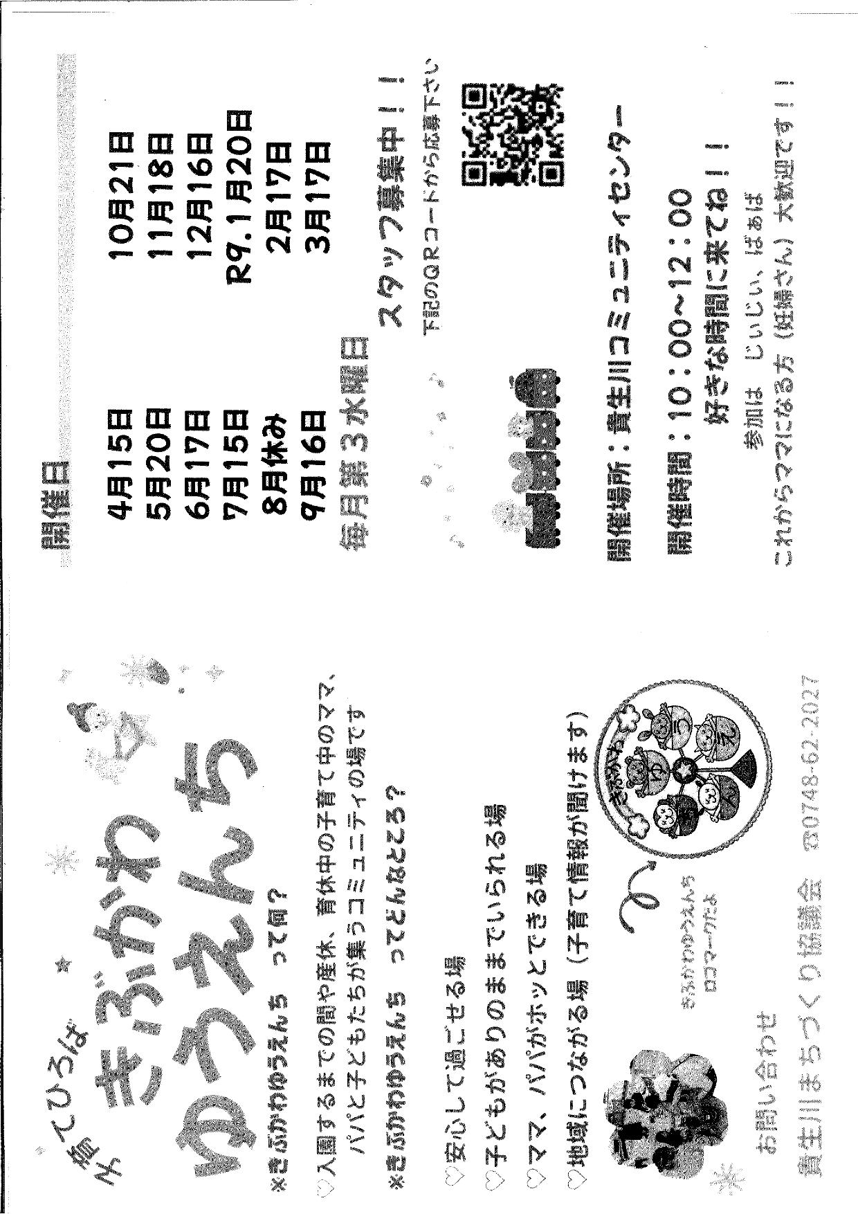 | 詳細 | 入園するまでの間や産休、育休中の子育てママ、パパとこどもたちが集うコミュニティの場です。 ・安心して過ごせる場 ・子どもがありのままでいられる場 ・ママ、パパがホッとできる場 ・地域につながる場(子育て情報が聞けます) 好きな時間に来てね!! |