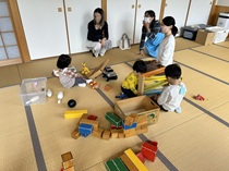地域のおじさん、おばさん達がおもちゃを準備してお待ちしています。子どもさんやお孫さんを連れて、遊びに来てください。おしゃべりをしながら一緒に遊んだりふれ合ったりして、楽しい時間をすごしてみませんか? 遊びの最後には、ふれあい遊びなどの提案をしています。家でもしてみてくださるとうれしいです。