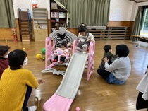 未就園のお子さんと親・祖父母が対象です。遊具で遊ぶ・手遊び・製作遊び・お話を聞く・季節に応じた活動(散歩・水遊び・運動会ごっこなど)を楽しんでいます。保護者同士・お子さん同士が遊びを通して顔なじみになり、おしゃべりをして楽しいひとときを過ごしています。お気軽にお越しください。